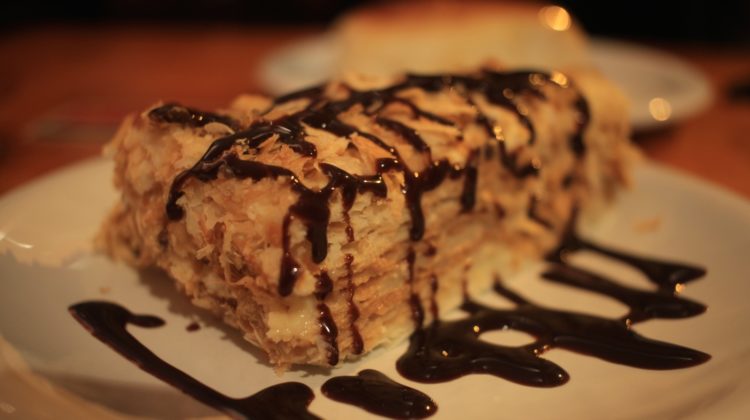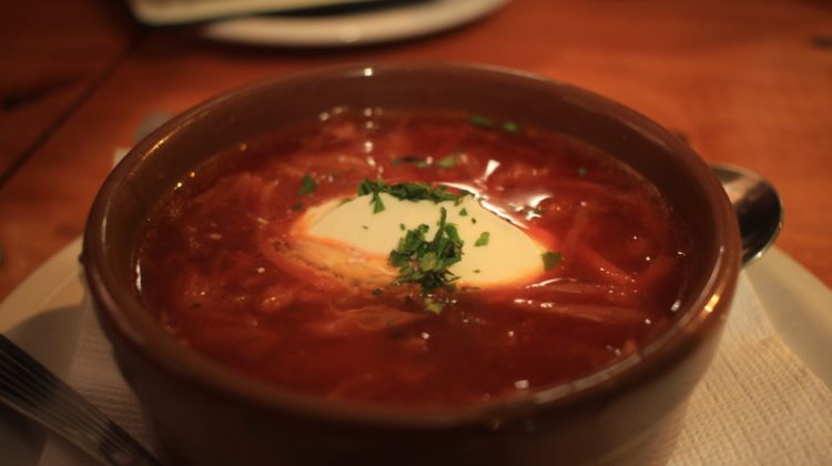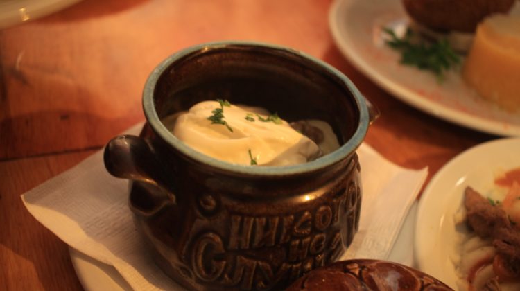 Son pedazos de lomo salteados en manteca. Pero mezclados con un caldo espectacular y mucha mostaza. Siempre arriba va la smetana (una salsa a base de yogurt, nata y limón). También tenía champis y… adivinen… sisi… cebolla.