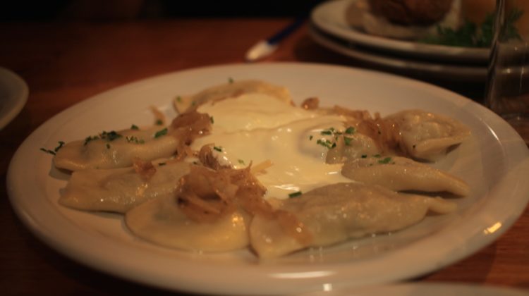 En este caso vinieron en una vasija grandecita y estaban rellenos de carne (de vaca y de cerdo). Por supuesto, el relleno también tenía cebolla. La salsa estaba buena y tenía pedazos de manteca. En algún lado, había repollo, porque sentimos su olorcito particular (olor a chucrut).