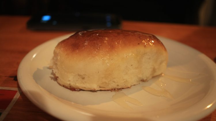 PIROSHOK: es un pan con leche, de masa medio cruda, con manzana y canela. Lo destrozamos.