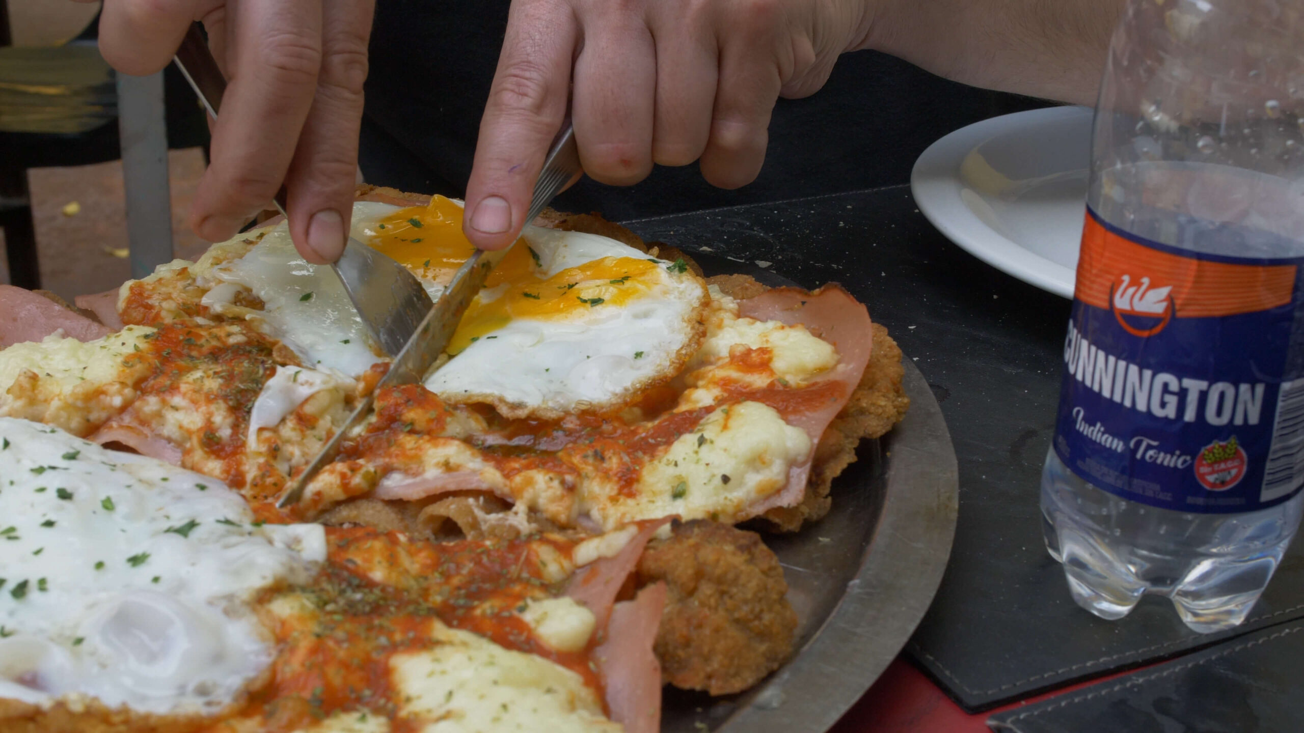 Después de las empanadas y habiendo pedido vino con hielo, pedimos rabas a la provenzal, la Super Milanga El Tábano (comen 3 o 4), unos ñoquis a la bolognesa y 3 postres. Todo regado con Cunnington, porque Matías abrió una botella que estaba batida y nos regó a todos (hay video).