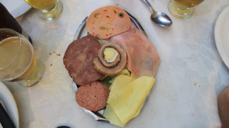 Surtido de fiambre: queso, jamón cocido, salchichón, leberwurst, morcillón (que es igual a la morcilla pero le ponen lengua), una ruedita de matambre y abajo de la fuente un montón de papines con aceite, vinagre y perejil que estaban geniales. Con el hambre que traíamos nos quedó un poco corta, pero si sos un ser humano está más que bien para empezar.