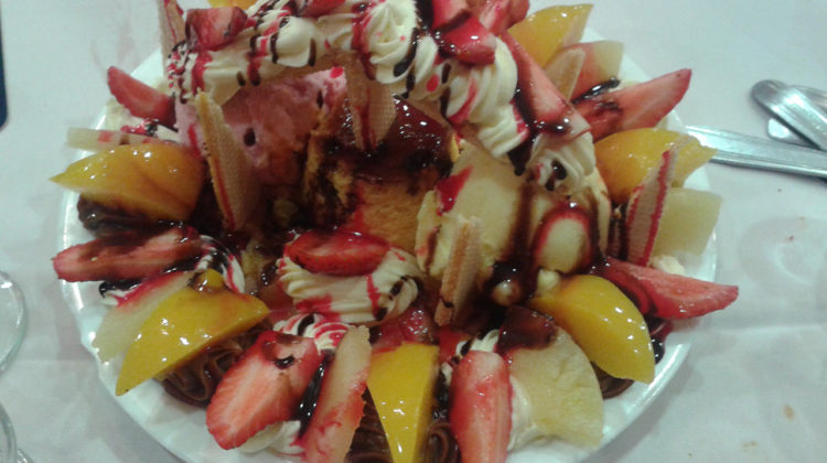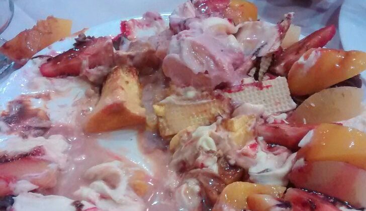 Postre Gran Taberna: Nos llegó esta recomendación por las redes sociales y, como de costumbre, decidimos hacerle caso. Es un misterio. Creemos que el cocinero agarra todos los postres de la carta y los mete en un mismo plato. Tiene helado, obleas, duraznos, frutillas, ananá, dulce de leche, crema y en el medio de todo eso, bajo un Arco del Triunfo fabricado con obleas, rodeado de más crema y cerezas, ¡APARECE UN FLAN!