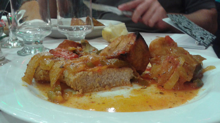 Tira de asado: No sé si a esta altura se acuerdan que llevamos a unos hermanos colombianos a comer. Y como todo visitante de nuestro país, lo que los mueve es la carne asada. Así que les dimos el gusto (somos más buenos en el Antigourmet!) y pedimos una porción de tira de asado. Trajo como para que comamos los siete. Te ponen la fuente en el medio de la mesa y te agarra tortícolis de la fuerza que hacés para mirar al que tenés del otro lado. No es una parrilla, y se especializa en comida española sobre todo, pero era una digna tira. En algunas partes un poco flaca, pero sabrosa, tiernita y bien cocida. La acompañamos con unas batatas fritas (ojo, hay que pedirlas aparte, la tira viene sin guarnición) que estaban un poco secas para el gusto de la mesa. Igual, los colombianos contentos, y eso es lo importante.